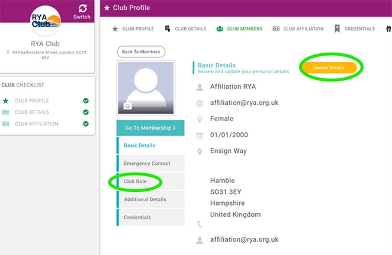 Click on Club Role then Update Details
