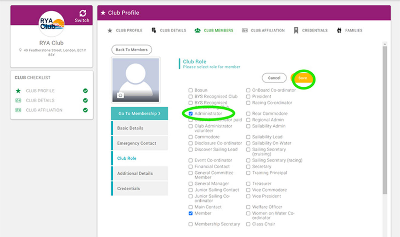 - To allow access to the club pages on the Affiliation portal please ensure the Administrator role is ticked at all times. We recommend allowing all of your committee members full access to the JustGo platform.